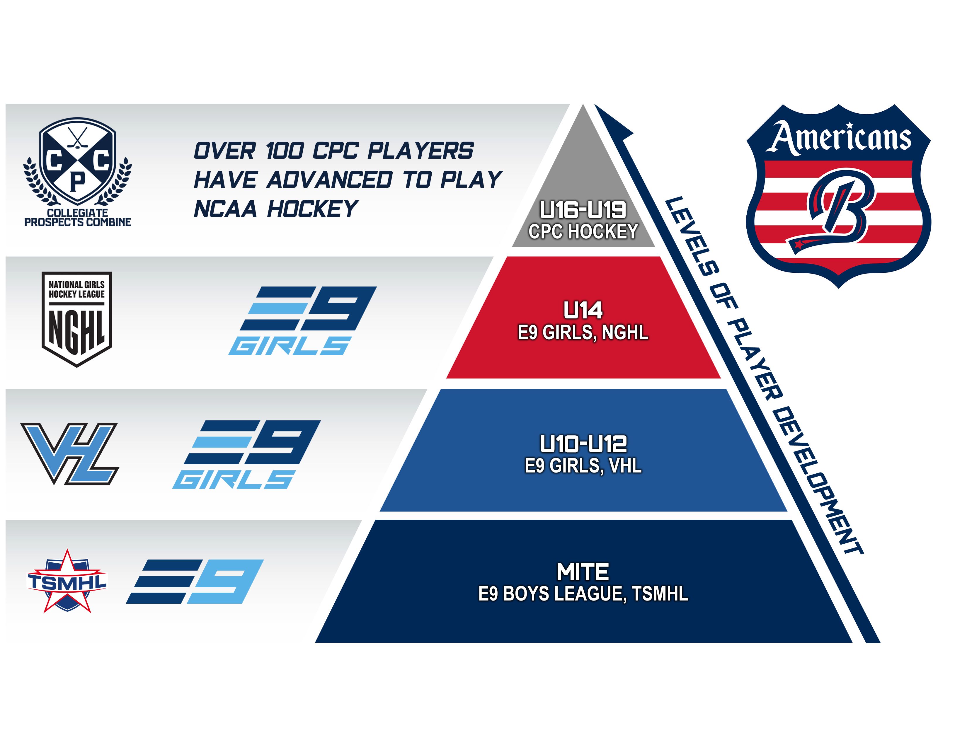 The members the of E9 Girls League are the only girls teams afforded the unique opportunity to also play against co-ed teams in the Valley Hockey League. As a member of the E9 the American girls program provides training and competition that no other girls program in New England offers, including the ability to compete in the VHL & E9/BHL against boys teams from across Massachusetts.